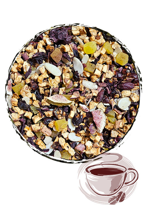 Фруктовий чай "Марципан" Склад: це суміш з яблука, інжиру, ананасу, мигдалю, каркаде, скоринки шипшини.